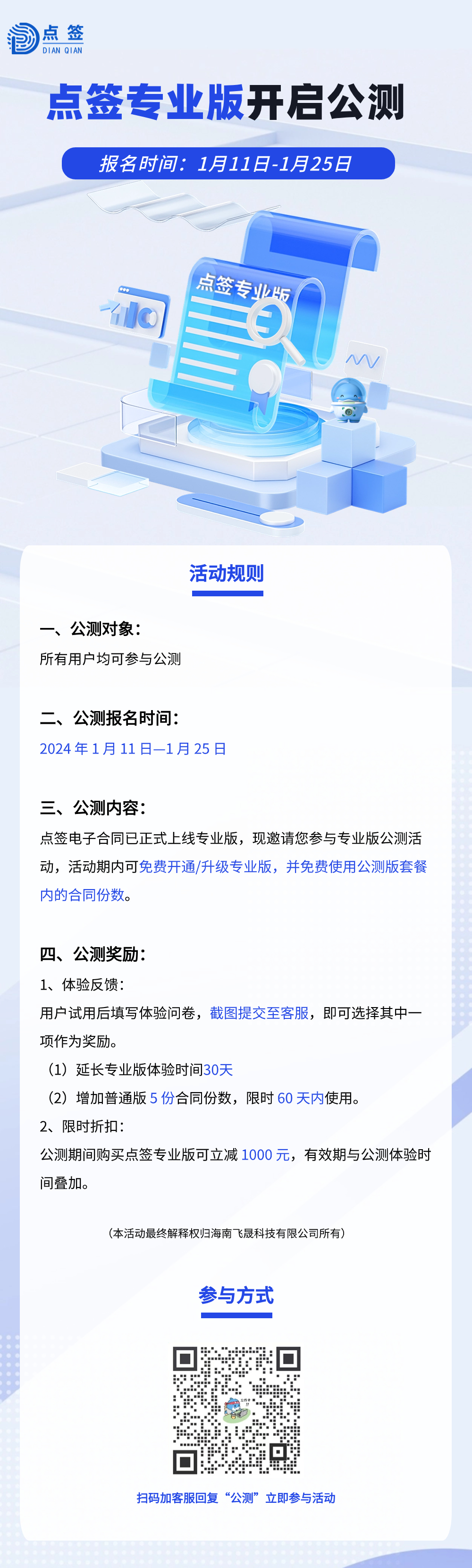 近期,点签电子合同专业版上线,邀请企业用户参与公测体验。公测期间,可免费使用套餐内的100份合同份数,购买专业版还可享受立减1000元的折扣优惠!仅剩一周报名截止,赶紧扫描海报中的二维码回复“公测”报名吧!