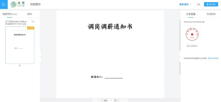 当员工出现调岗的情况时,HR可以通过点签电子合同平台,一键发送《调岗通知书》、《工作调动确认函》、《转岗/调岗确认单》等文件,让员工一次性进行签署。
