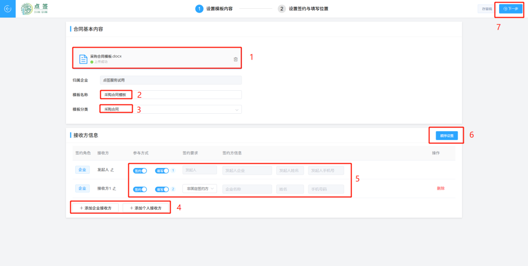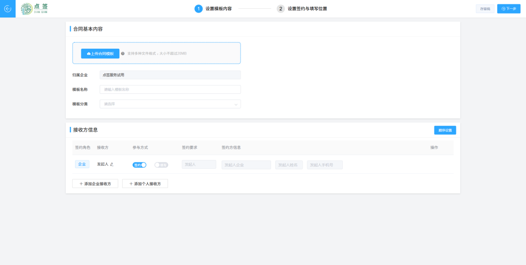 上传合同模板后,设置模板名称,并进行模板分类(模板分类可以在模板管理中设置),随后进行接收方信息设置,包括签约角色-企业/个人、参与方式、签约要求、签约顺序等,如下图所示。