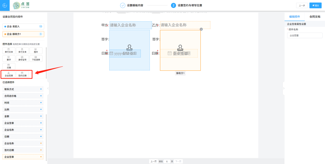 如果该份合同涉及双方盖章,此处可以通过组件“企业签章”“签约日期”的应用实现指定位置盖章。如下图所示,蓝色代表企业-发起人指定位置盖章区域,橙色代表企业-接收方指定位置盖章的区域。