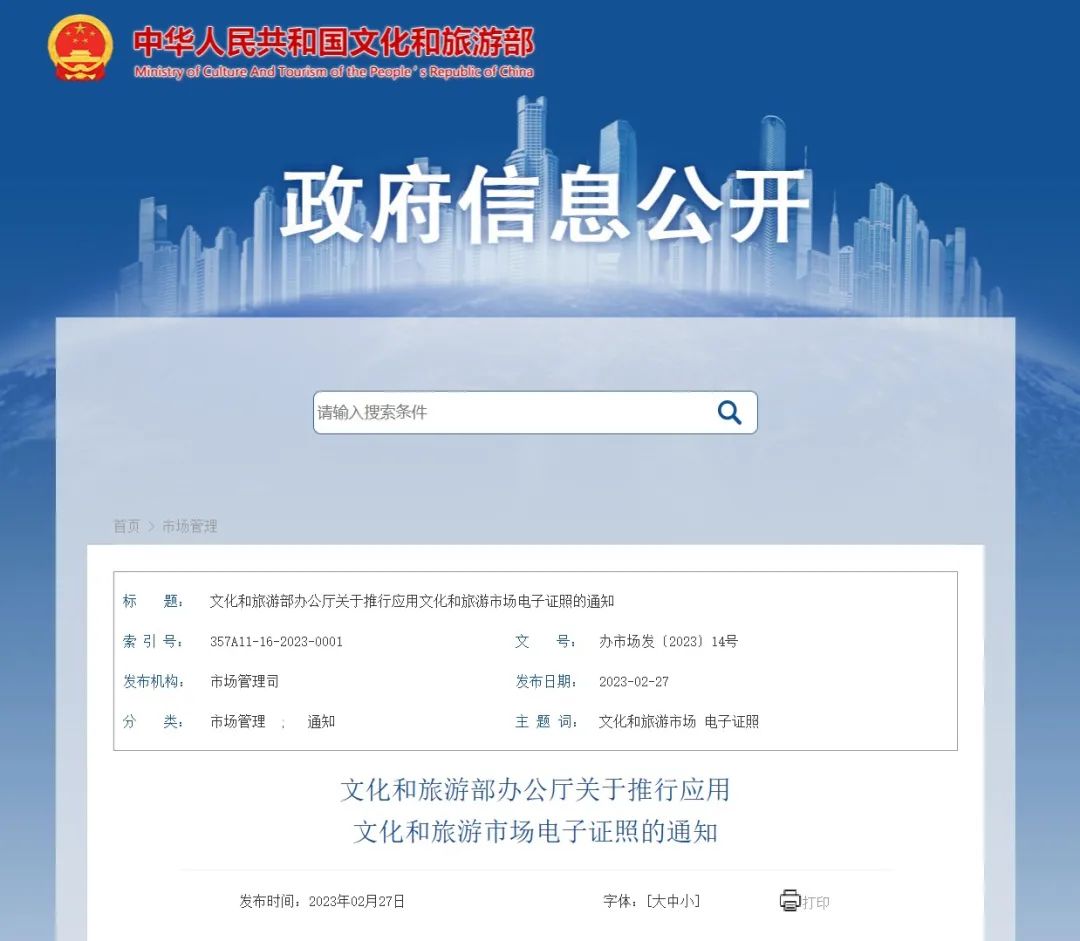 近期,文化和旅游部印发《关于推行应用文化和旅游市场电子证照的通知》(以下简称《通知》),决定自2023年3月1日起,在全国范围内推行应用文化和旅游市场涉企电子证照;启用文化和旅游市场电子印章。