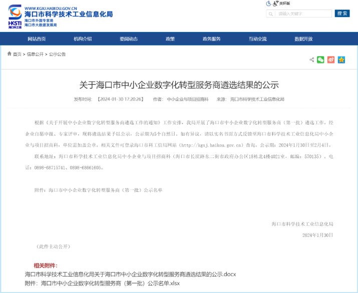 近日,海口市科学技术工业信息化局发布《关于海口市中小企业数字化转型服务商遴选结果的公示》。